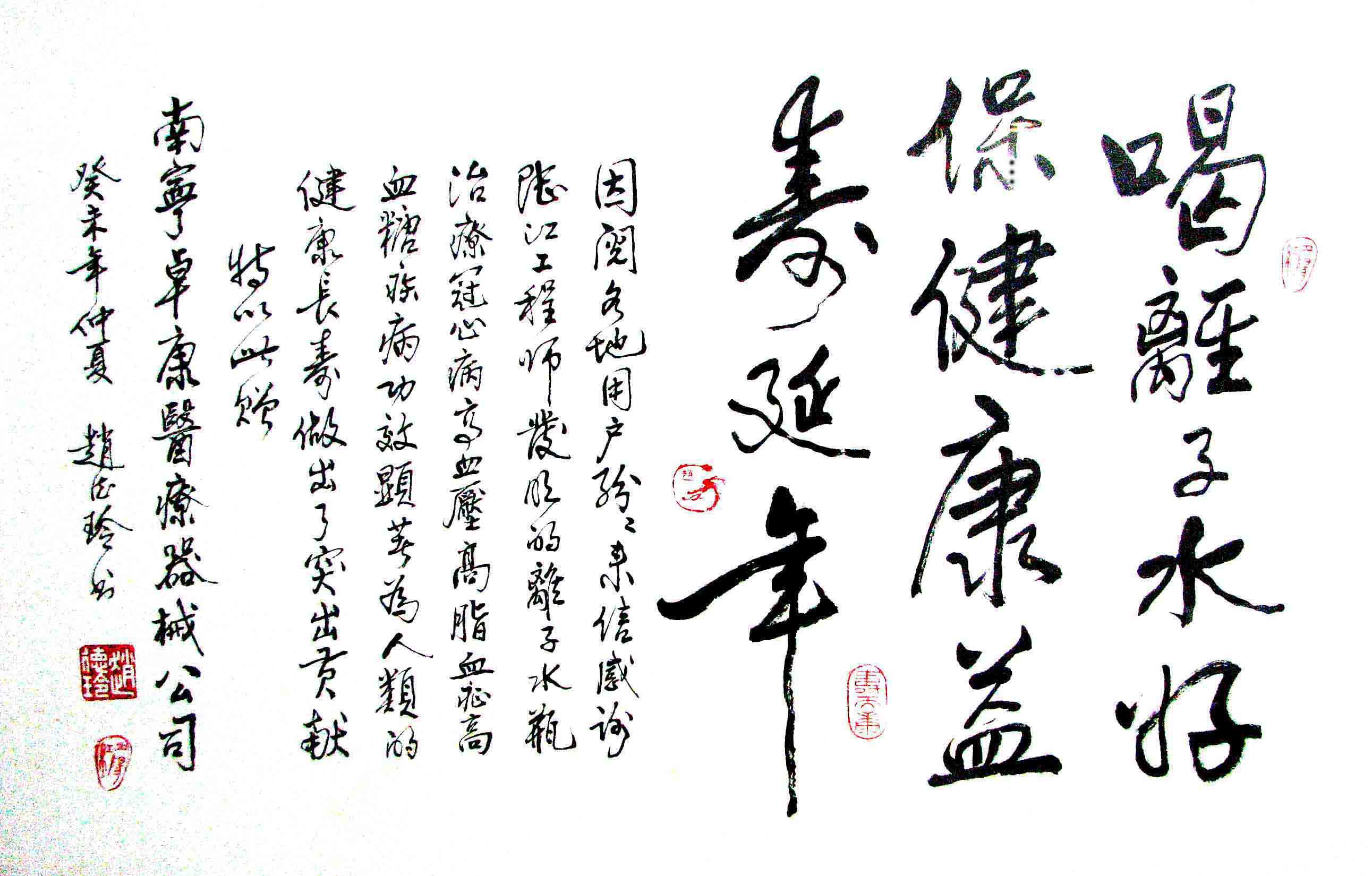 ---本品處理水用核磁共振測定值為55.82Hz(赫茲),為富含4-6個水分子小簇團的微小分子團水,可與世界各地長壽村水媲美。本品曾經(jīng)三家省級醫(yī)院做臨床觀察,經(jīng)北京和廣西醫(yī)學(xué)專家鑒定,22年來對以上病癥承諾療效,大量原發(fā)性高血壓患者飲用4至6個月內(nèi)停藥,血壓正常穩(wěn)定,癥狀消除,逐漸逆轉(zhuǎn)至消除動脈粥樣硬化;冠心病患者在3至5個月內(nèi)逐漸減輕至消除心痛胸悶,一年左右痊愈,心腦電圖正常。這是根據(jù)中國基礎(chǔ)醫(yī)學(xué)研究成果和生命科學(xué)原理轉(zhuǎn)化為醫(yī)學(xué)應(yīng)用的杰出成果,使人從細胞到器官發(fā)展至全身健康。2型糖尿病患者使用3-10月內(nèi)痊愈。中風(fēng)后遺癥患者7-10個月改善至消除肢體和語言障礙。用戶最新報告:尿毒癥患者飲用兩個月,指標(biāo)已經(jīng)大為改善,適合腎衰和透析者使用。以上均為史無前例的轉(zhuǎn)化醫(yī)學(xué)應(yīng)用,產(chǎn)品壽命30年,不換芯。