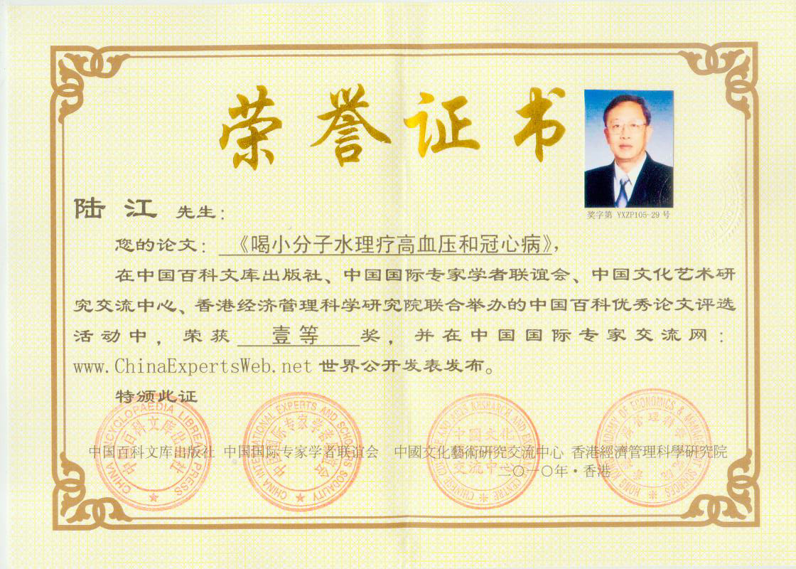 -----我是從事建筑的高工,本來沒有資格去攻克醫(yī)學(xué)難題,卻為了自身健康才扣響醫(yī)學(xué)的大門。由于我1990年患高血壓,因怕中風(fēng)才研究發(fā)明了離子水瓶,我把水處理成微小分子團水,飲用后治愈了高血壓。便于1993年底送到三家省級醫(yī)院做臨床試用4個月。經(jīng)北京和廣西醫(yī)學(xué)專家鑒定:"降脂降壓效果好"," 能擴大心腦動脈流量,改善心腦電圖以及微循環(huán)","對治療心腦動脈粥樣硬化、高血壓、高血脂有良好的醫(yī)療保健作用。""產(chǎn)品的技術(shù)性能和療效達到了同類產(chǎn)品的國內(nèi)領(lǐng)先水平,經(jīng)廣西醫(yī)學(xué)科學(xué)情報研究所檢索,未見國外有類似報道。"中國醫(yī)學(xué)科學(xué)院張正國教授從美國國立醫(yī)學(xué)圖書館數(shù)據(jù)庫存Medline檢索英俄文資料,均未見類似報告。2000年上市后,我為了對消費者負責(zé)而繼續(xù)觀察研究,一直通過《信譽卡》和《質(zhì)量跟蹤調(diào)查書》向患者承諾療效,請用戶使用6個月后反饋效果。和脂壓患者飲用2至5個月內(nèi),消除癥狀,停服藥物,血壓正常;冠心病患者飲用3~5個月逐漸減輕至消除心絞痛、房顫等癥狀,不再服藥,飲用1年左右心電圖正常,經(jīng)冠脈造影掃描無明顯狹窄,表明冠心病痊愈。大量患者還反映許多衰弱器官被修復(fù),讓前列腺增生、慢性咽喉炎、慢性氣管炎、支氣管炎、慢性胃炎、腸炎和膽囊炎等不藥而愈;2型糖尿病患者是因為胰島衰弱致病,飲用該水半年至一年,逐漸減藥至停藥,血糖尿糖正常,真正治愈2型糖尿病。中風(fēng)后遺癥患者飲用六七個月,可逐漸減輕至消除肢體和語言障礙,表明飲用該水能讓壽命很長的神經(jīng)元細胞逐漸修復(fù),奇跡般地恢復(fù)肢體和語言功能。飲用后還使胸腺和脾臟兩個重要的免疫器官被修復(fù)和增強,產(chǎn)生免疫細胞多,提高了免疫力,使人不生病或少生病。自此, 飲用微小分子團水創(chuàng)造了攻克冠心病、高(低)血壓和糖尿病三大醫(yī)學(xué)難題的奇跡。人們對此感到不可思議,但實踐是檢驗真理的唯一標(biāo)準(zhǔn)。